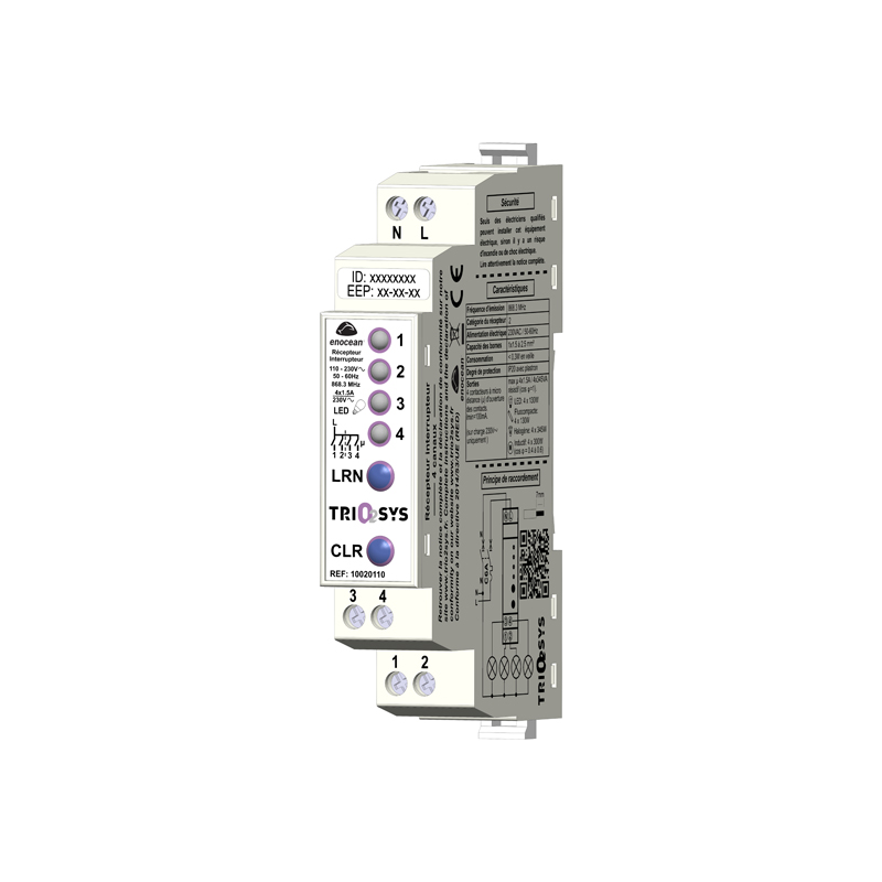 Le récepteur modulaire compact 4 canaux sert à recevoir les signaux radio provenant démetteurs interrupteur ou de capteurs EnOcean à sa portée pour commuter des charges déclairage type LED et fluocompacte :