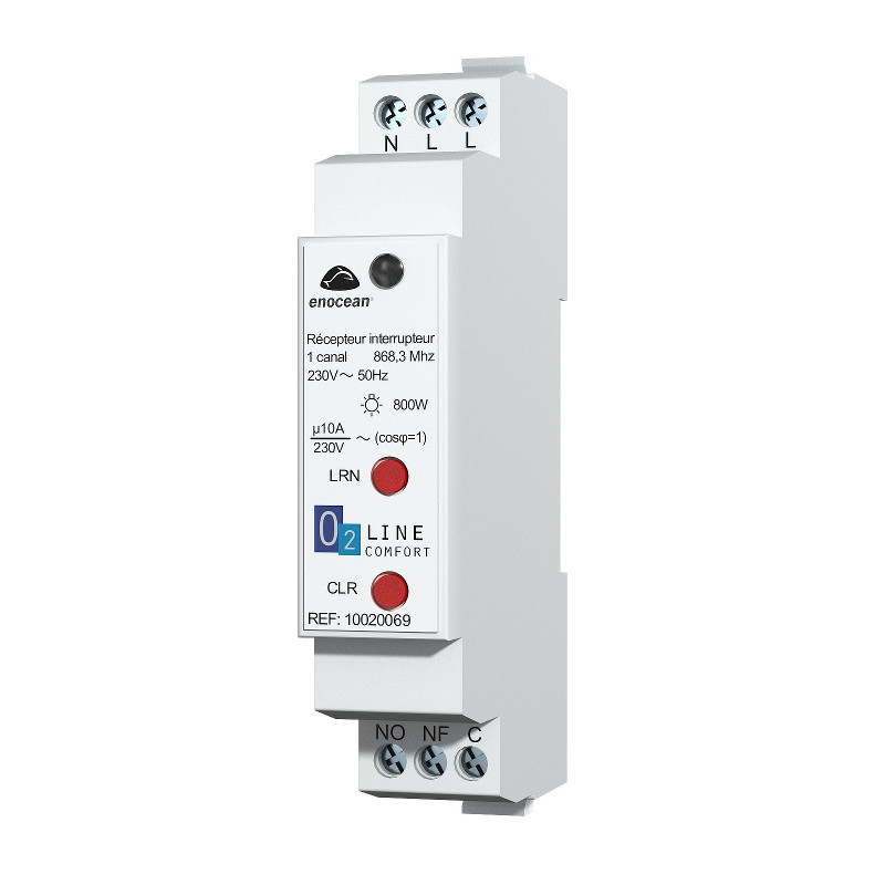 Le récepteur radio RAIL DIN 1 canal 10A est utilisé pour commuter divers appareils électriques de charge 230V, tels que lampes à incandescence, lampes halogènes, ballasts électroniques, ventilateurs, depuis un émetteur radio Enocean sans piles et sans fils: